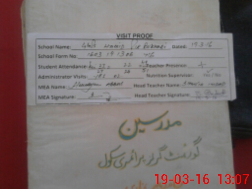 | School Visited by School Health & Nutrition Supervisor (No. of Visits) | 1 | Name1: | Javed Maqsood | Name2: | |