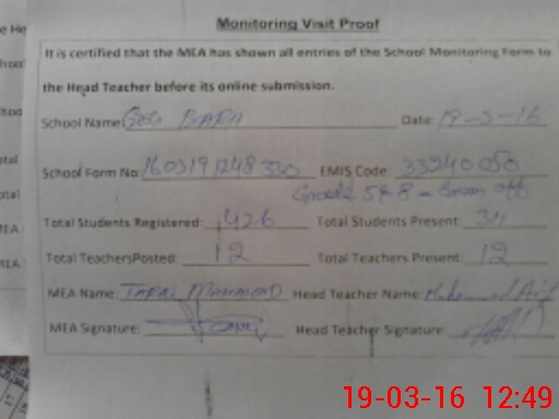 | Attendance Register | Head Teacher | MEA with School | Visit Proof |