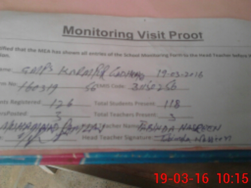 | Attendance Register | Head Teacher | MEA with School | Visit Proof |