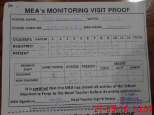 | Attendance Register | Head Teacher | MEA with School | Visit Proof |