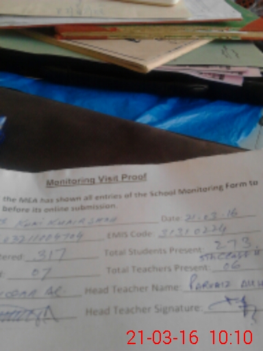 | School Visited by School Health & Nutrition Supervisor (No. of Visits) | 1 | Name1: | M Javed | Name2: | Nil |