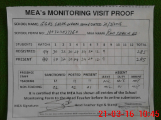 | Attendance Register | Head Teacher | MEA with School | Visit Proof |