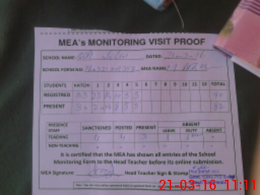 | Attendance Register | Head Teacher | MEA with School | Visit Proof |