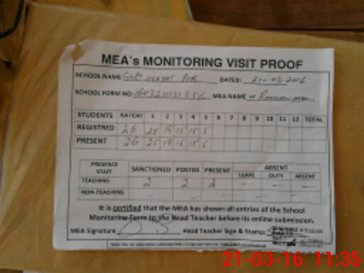 | Attendance Register | Head Teacher | MEA with School | Visit Proof |