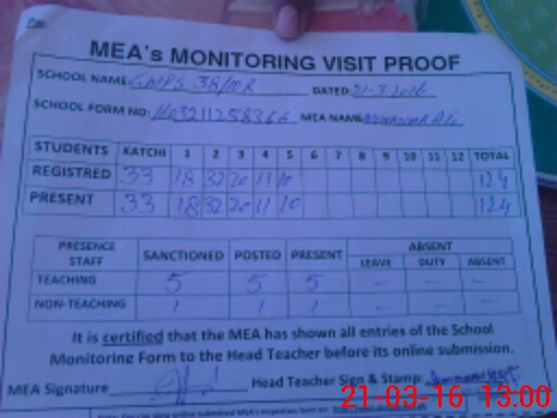 | Attendance Register | Head Teacher | MEA with School | Visit Proof |