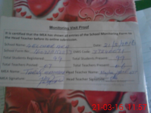 | Attendance Register | Head Teacher | MEA with School | Visit Proof |