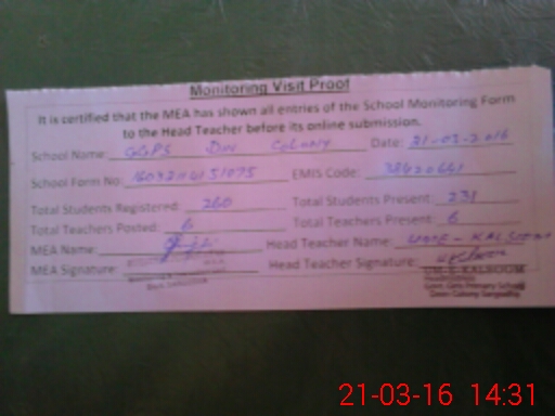 | Attendance Register | Head Teacher | MEA with School | Visit Proof |