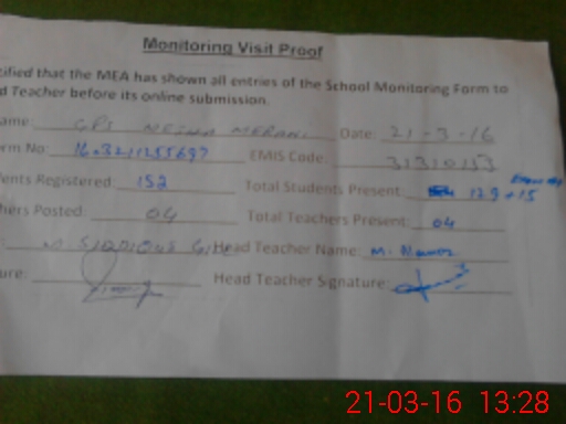 | Attendance Register | Head Teacher | MEA with School | Visit Proof |