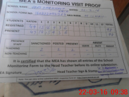 | Attendance Register | Head Teacher | MEA with School | Visit Proof |