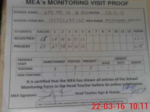 | Attendance Register | Head Teacher | MEA with School | Visit Proof |