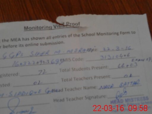 | Attendance Register | Head Teacher | MEA with School | Visit Proof |