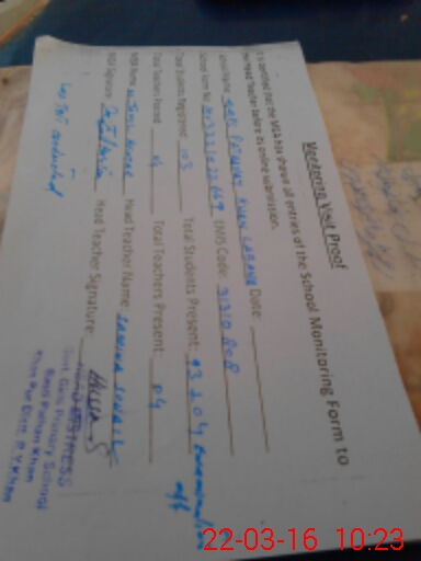 | School Visited by School Health & Nutrition Supervisor (No. of Visits) | 1 | Name1: | Ali Raza | Name2: | Nil |