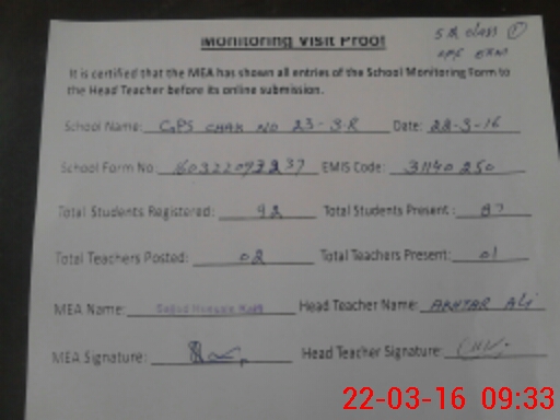 | EMIS Code: 31140250 | Name of School: GPS CHAK NO 23/3-R | |||