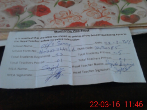 | Attendance Register | Head Teacher | MEA with School | Visit Proof |