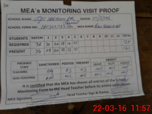 | Attendance Register | Head Teacher | MEA with School | Visit Proof |