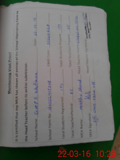 | Remarks (Use Separate Page if Required): 5th class exam off Supplementary Reading material Availability no Utilization no Boundary wall is not exist male portion | |||||