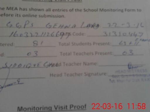 | Attendance Register | Head Teacher | MEA with School | Visit Proof |