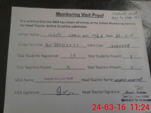 | Attendance Register | Head Teacher | MEA with School | Visit Proof |