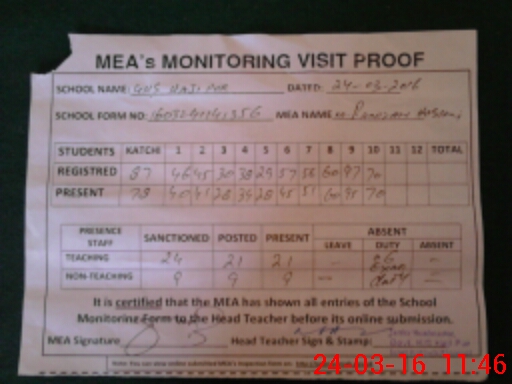| Attendance Register | Head Teacher | MEA with School | Visit Proof |