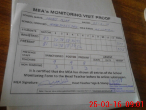 | Attendance Register | Head Teacher | MEA with School | Visit Proof |