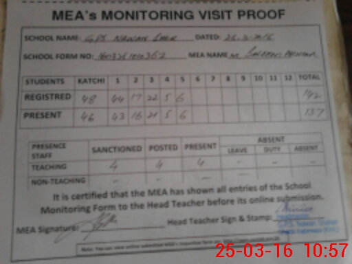 | Attendance Register | Head Teacher | MEA with School | Visit Proof |