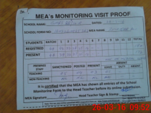 | Attendance Register | Head Teacher | MEA with School | Visit Proof |