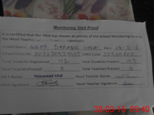 | EMIS Code: 32320607 | Name of School: GGPS SARANG WALA | |||