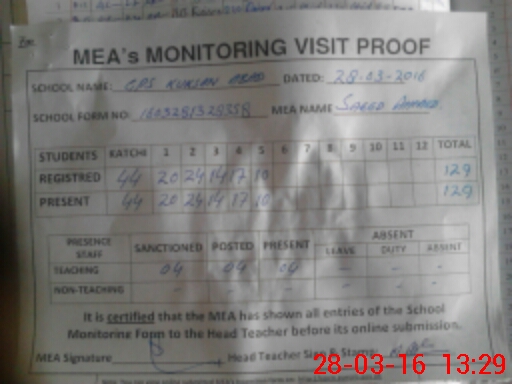 | Attendance Register | Head Teacher | MEA with School | Visit Proof |
