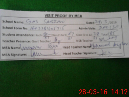 | EMIS Code: 32430008 | Name of School: GHS SABZANI | |||