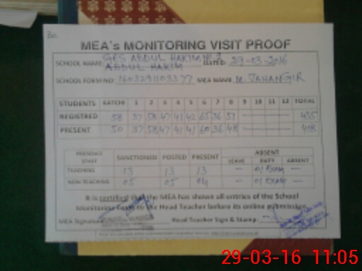 | Attendance Register | Head Teacher | MEA with School | Visit Proof |