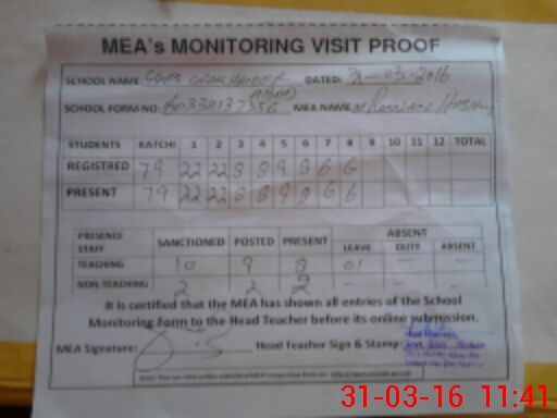 | Attendance Register | Head Teacher | MEA with School | Visit Proof |