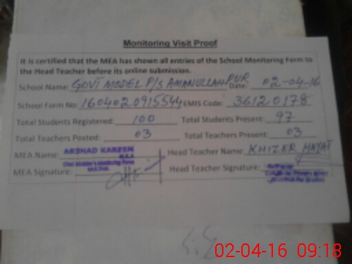 | EMIS Code: 36120178 | Name of School: GMPS AMAN ULLAH PUR SHUJABAD | |||
