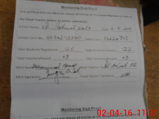 | Attendance Register | Head Teacher | MEA with School | Visit Proof |