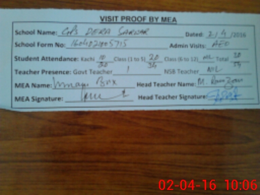 | Attendance Register | Head Teacher | MEA with School | Visit Proof |