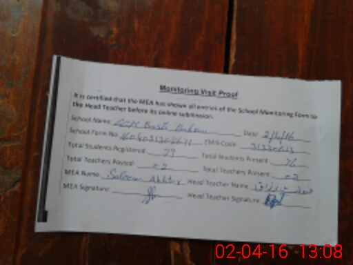 | Attendance Register | Head Teacher | MEA with School | Visit Proof |