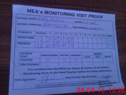 | Attendance Register | Head Teacher | MEA with School | Visit Proof |