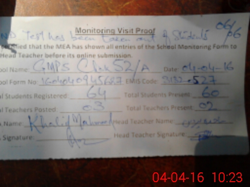 | EMIS Code: 31320527 | Name of School: GMPS CHAK NO.52/A | |||