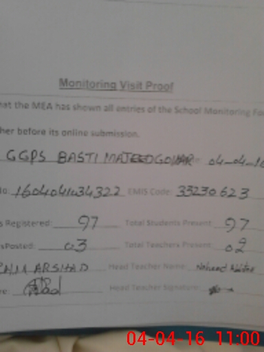 | Attendance Register | Head Teacher | MEA with School | Visit Proof |