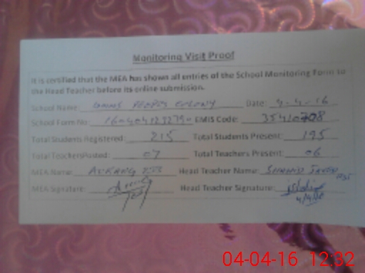| Attendance Register | Head Teacher | MEA with School | Visit Proof |