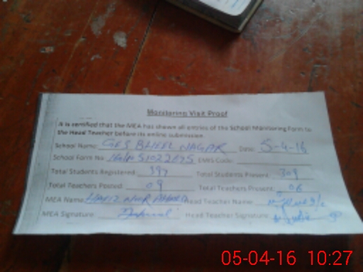 | Attendance Register | Head Teacher | MEA with School | Visit Proof |