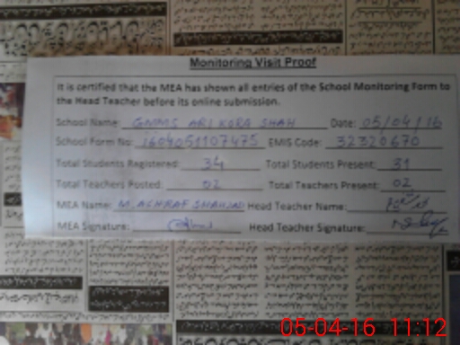 | EMIS Code: 32320670 | Name of School: GPS ARI KORA SHAH | |||