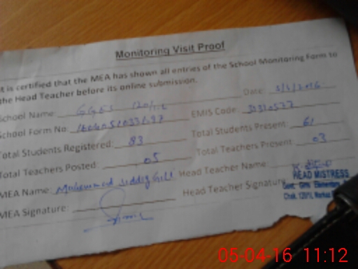| Attendance Register | Head Teacher | MEA with School | Visit Proof |