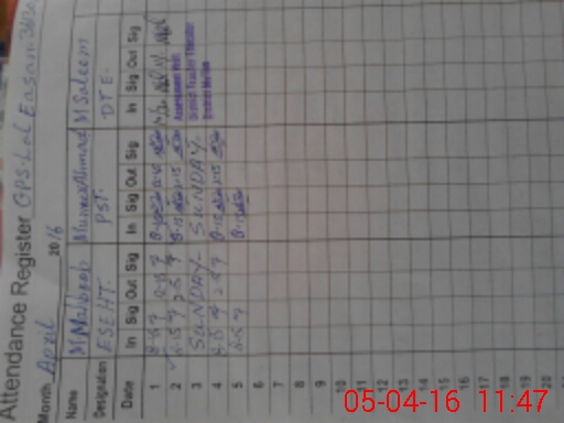| Monitoring Date: 05-04-2016 | Start Time: 05-04-2016 11:37 AM | End Time: 05-04-2016 11:54 AM | Name of MEA: MU**** AK**** KH**** | |
