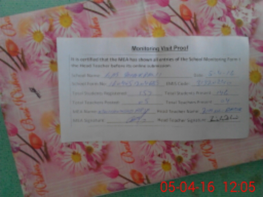 | Attendance Register | Head Teacher | MEA with School | Visit Proof |