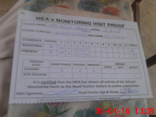 | Attendance Register | Head Teacher | MEA with School | Visit Proof |