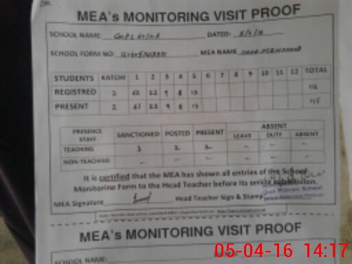 | Attendance Register | Head Teacher | MEA with School | Visit Proof |