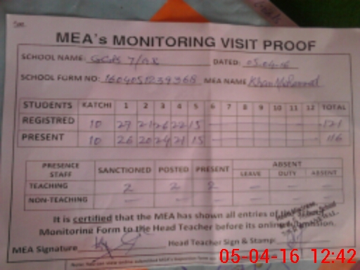 | Attendance Register | Head Teacher | MEA with School | Visit Proof |