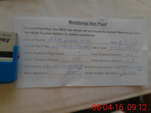 | Attendance Register | Head Teacher | MEA with School | Visit Proof |
