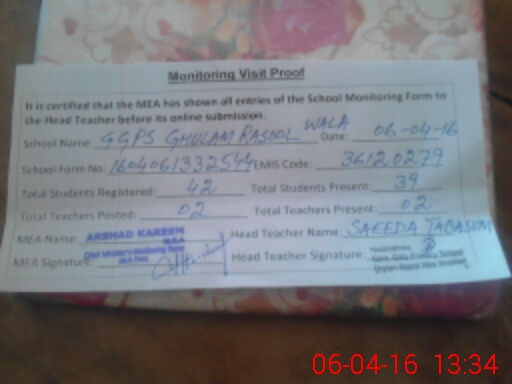 | Remarks (Use Separate Page if Required): 01 Toilet Block under construction In Teacher list name of Shabam Farhat is incorrect Correct name is Shabana Farhat Ahmed Din Chowkidar is temporarily attached from GGPS Anaran wala and present at the time of visit | |||||