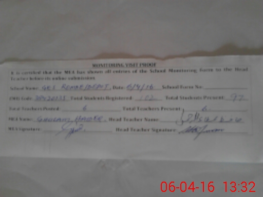| Attendance Register | Head Teacher | MEA with School | Visit Proof |
